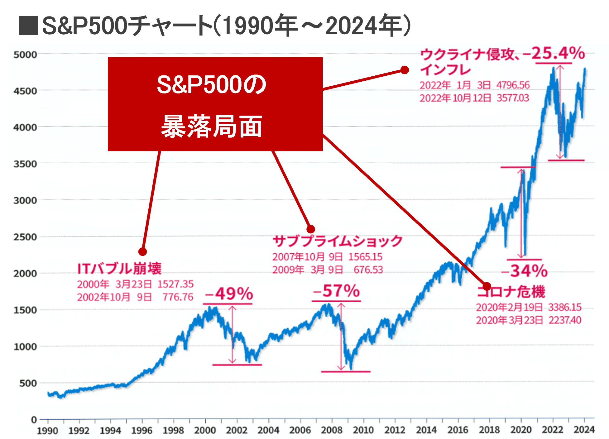 例えば米国市場を代表する株価指数のS&P500は度重なる下落局面を経験していましたが、30年という長期スパンで見れば10倍以上の値上がりを見せています。